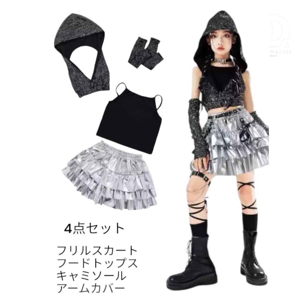黒、グレーベースにグリッター素材を組み合わせたこちらの衣装は、K-POP・ヒップホップ・ジャズファンクなど幅広いジャンルに対応。